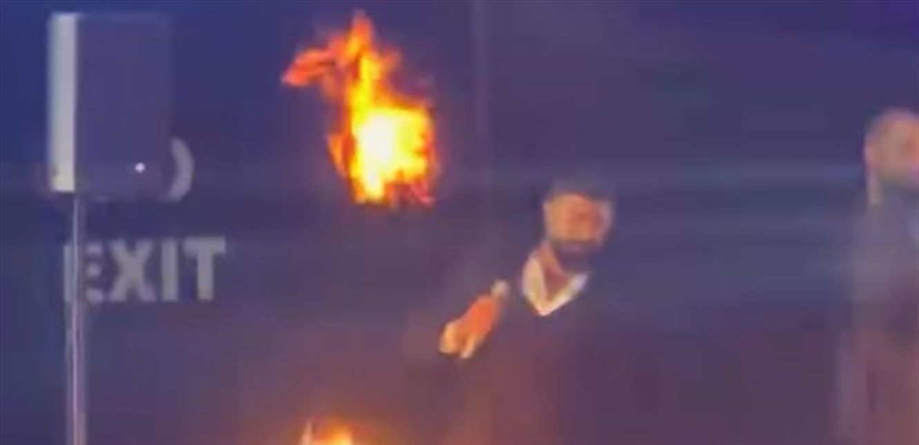 نبيل الذي كان يغني أمام الجمهور تفاجأ باشتعال النيران أمامه على المسرح حيث يبدو انها كانت مفرقعات نارية.