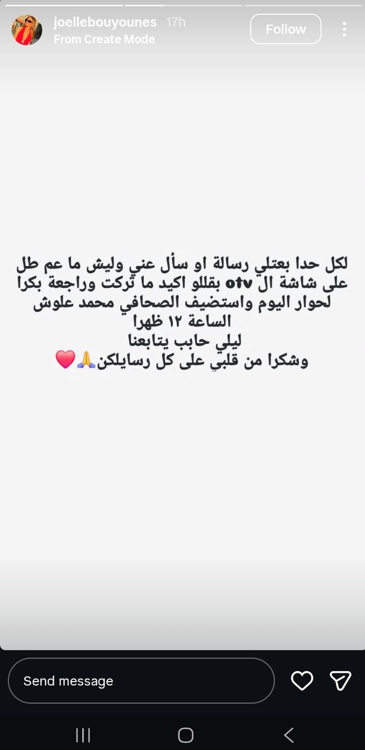 وكتبت بو يونس عبر خاصية "ستوري" عبر حسابها على "انستغرام": "لكل حدا بعتلي رسالة أو سأل عني وليش ما عم طلّ على شاشة الـ"otv"، بقللو أكيد ما تركت وراجعة لحوار اليوم".