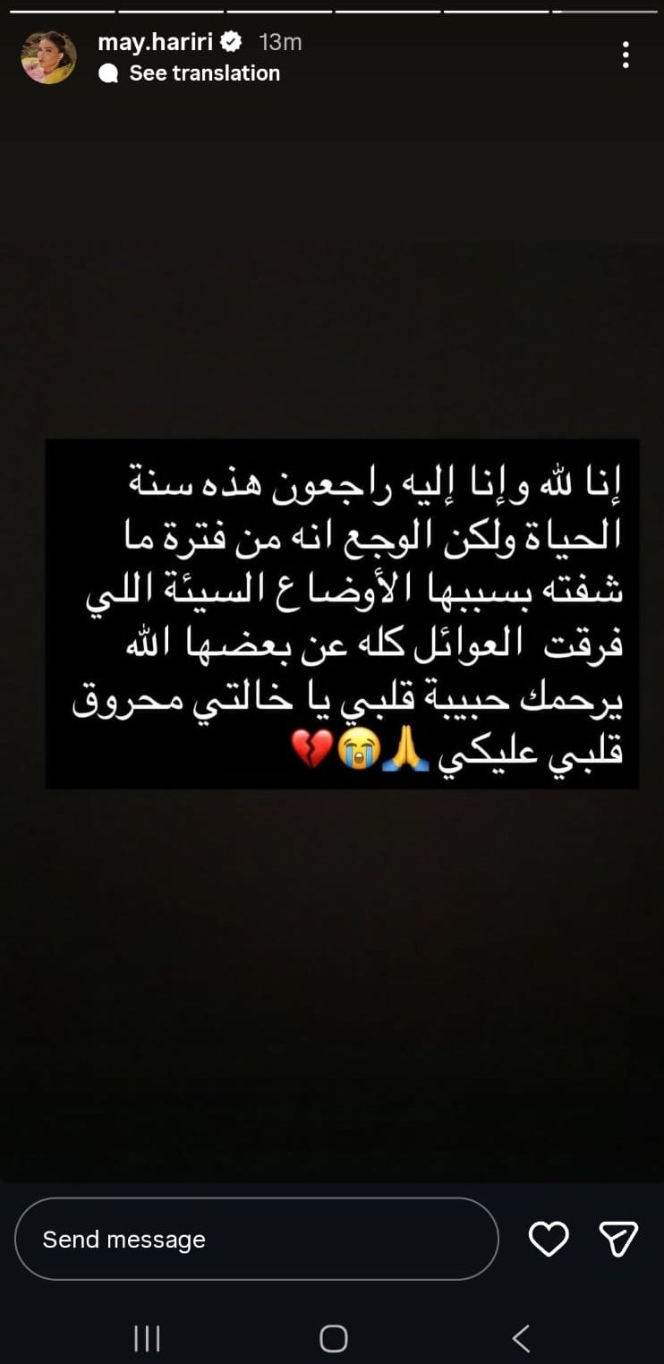 أعلنت الفنانة ميّ حريري عبر خاصية "ستوري" عبر حسابها على "انستغرام"، عن وفاة خالتها. Advertisement وقالت حريري: "إنا لله وإنا إليه راجعون هذه سنة الحياة. الله يرحمك حبيبة قلبي يا خالتي محروق قلبي عليكي".