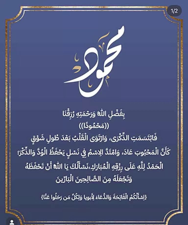 وأعلن الخبر عبر حسابه الرسمي على "إنستغرام"، حيث كتب: "بفضل الله ورحمته رزقنا محمودا، اللهم لك الحمد والشكر".