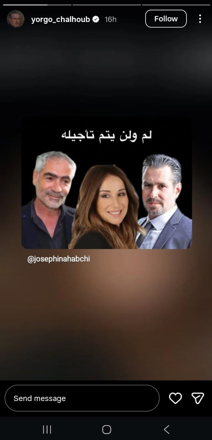 بعد إعلان الصحافي إيلي مرعب عن إمكانيّة تأجيل مسلسل "المحافظة 15" الرمضانيّ، بسبب أحد الممثلين، خرج الممثل يورغو شلهوب عن صمته، وأكّد أنّ العمل الرمضانيّ مستمرّ.