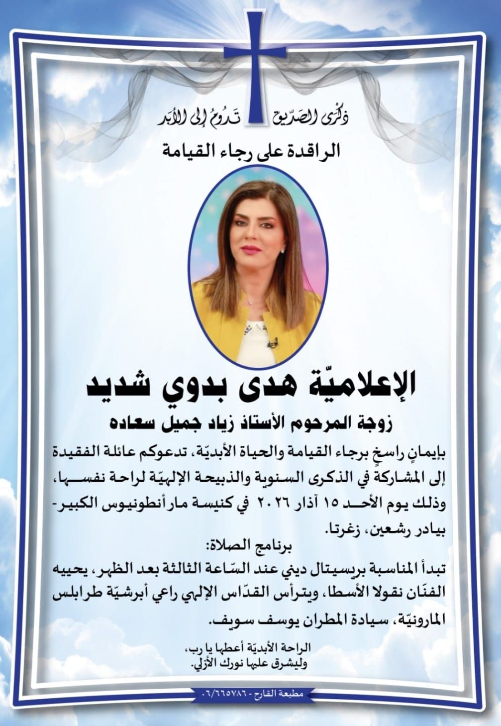 في الذكرى السنوية الأولى، يلتقي جميع الذين أحبوا هدى للصلاة والتذكر والتأمل، في لقاء دعت إليه عائلتها، يوم الأحد 15 آذار 2026، في كنيسة مار أنطونيوس الكبير – بيادر رشعين، زغرتا.