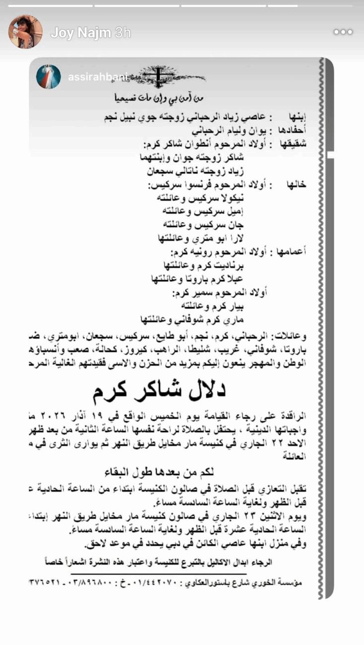 أعلنت عائلة الراحلة دلال كرم، الزوجة السابقة للفنان الراحل زياد الرحباني، عن تفاصيل جنازتها.