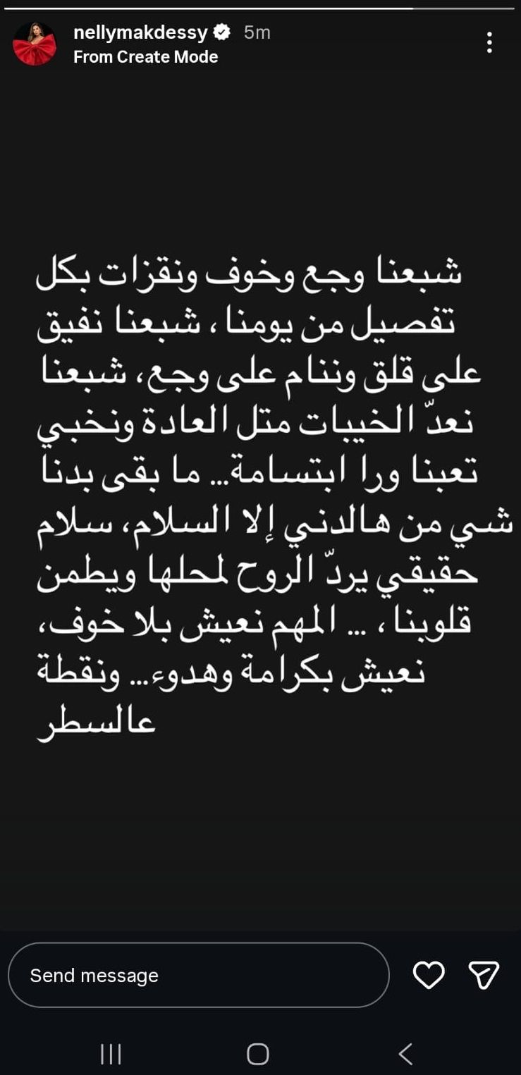قالت الفنانة نيللي مقدسي "شبعنا وجع وخوف ونقزات بكل تفصيل من يومنا، شبعنا نفيق على قلق ونام على وجع، شبعنا نعدّ الخيبات متل العادي ونخبي تعبنا ورا إبتسامة".