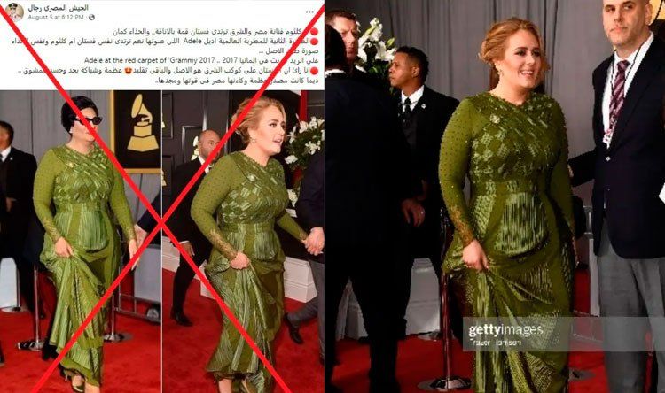 ويبدو أن بعض المستخدمين، تعمّدوا استخدام الصورتين في سياق مضلّل على أنّ أديل ارتدت نفس فستان “كوكب الشرق” أم كلثوم. كما أن جوائز غرامي توزّع في الولايات المتحدة وليس في ألمانيا، كما روّجت المنشورات المضلّلة.