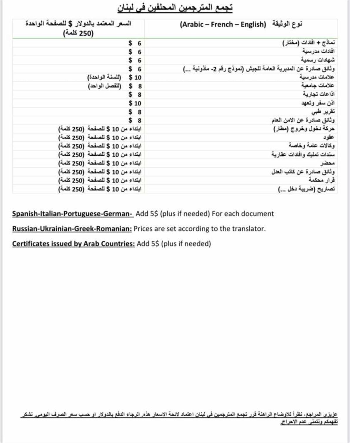 كذلك، فقد بلغ سعر ترجمة العلامات المدرسية وأذون السفر 10 دولارات، التقارير الطبية والوثائق الصادرة عن الأمن العام 8 دولارات، وبلغت باقي المعاملات كقرارات المحاكم والوكالات وسندات التمليك 10 دولارات للصفحة الواحدة.