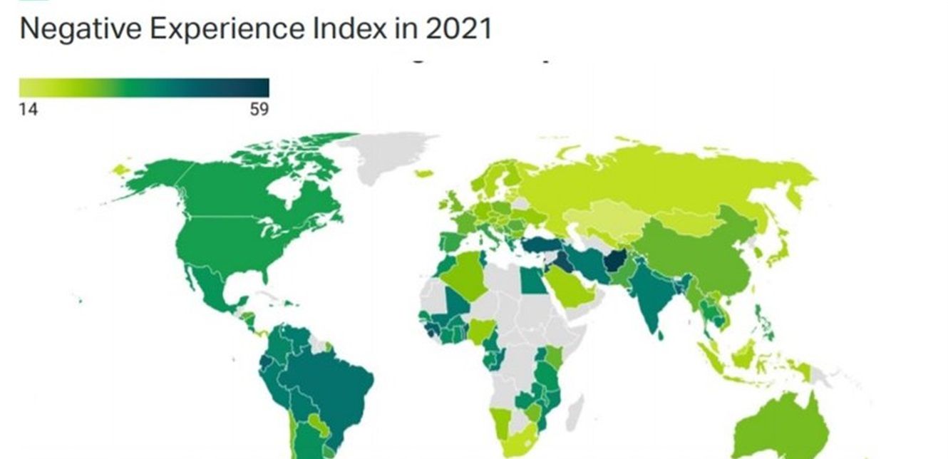 ووفقا للاستطلاع كان عام 2021 الأكثر من ناحية المشاعر السلبية حول العالم مقارنة بباقي السنوات، حيث ارتفعت معدلات التوتر والتعاسة والغضب والقلق والألم الذي يشعر به الناس كل يوم.