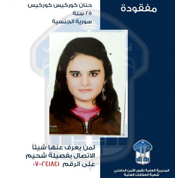 عمّمت المديريّة العامّة لقوى الأمن الدّاخلي بناءً على إشارة القضاء المختص، صورة المفقودة: حنان كوركيس كوركيس (مواليد عام 1997، سوريّة)، التّي غادرت بتاريخ 14-9-2022 مكان اقامتها في محلّة داريّا، ولم تَعُد لغاية تاريخه، مع العلم انها تعاني من حالة اكتئاب.