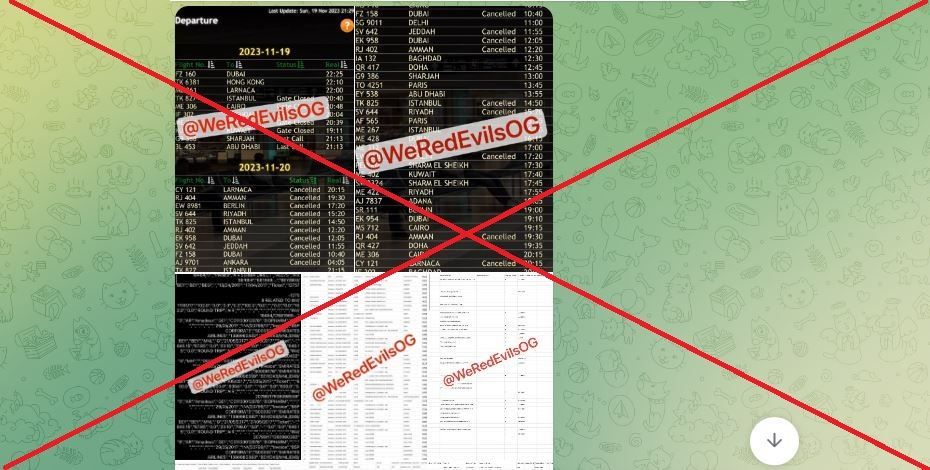 خلال الأيام الماضية، تناقل مستخدمون لوسائل التواصل الاجتماعي، لا سيما في لبنان، منشوراُ يزعم ان "قراصنة اسرائيليين اسمهم we red evils نجحوا في قرصنة انظمة مطار رفيق الحريري الدولي، في 19 تشرين الثاني 2023، الامر الذي أوقع المطار في شلل وتسبب بإلغاء رحلات فيه".