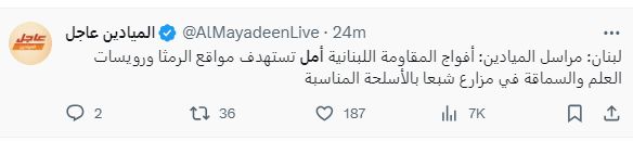 أفادت قناة "الميادين" بأن أفواج المقاومة اللبنانية "أمل" استهدفت مواقع الرمثا ورويسات العلم والسماقة في مزارع شبعا بالأسلحة المناسبة.