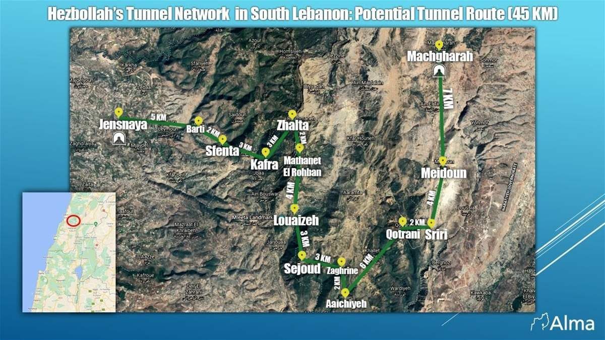 ونشر المعهد الإسرائيلي خريطة تُظهر مسار نفق يمتلكه "حزب الله" ويبدأ من منطقة جنسنايا - قضاء جزين وصولاً إلى بلدة مشغرة في البقاع الغربيّ.