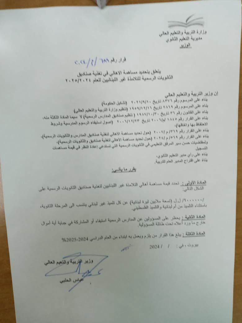اصدر وزير التربية والتعليم العالي القاضي عباس الحلبي قرارين، يتعلق الاول بتحديد مساهمة الاهالي في تغذية صناديق الثانويات الرسمية للتلامذة غير اللبنانيين للعام 2024-2025، والثاني بتصحيح خطأ مادي واقع في القرار رقم 680/م/2024 تاريخ 21/8/2024 (المتعلق بتحديد مساهمة الاهالي في تغذية صناديق المدارس الرسمية والثانويات الرسمية التي تضم الحلقة الثالثة).
