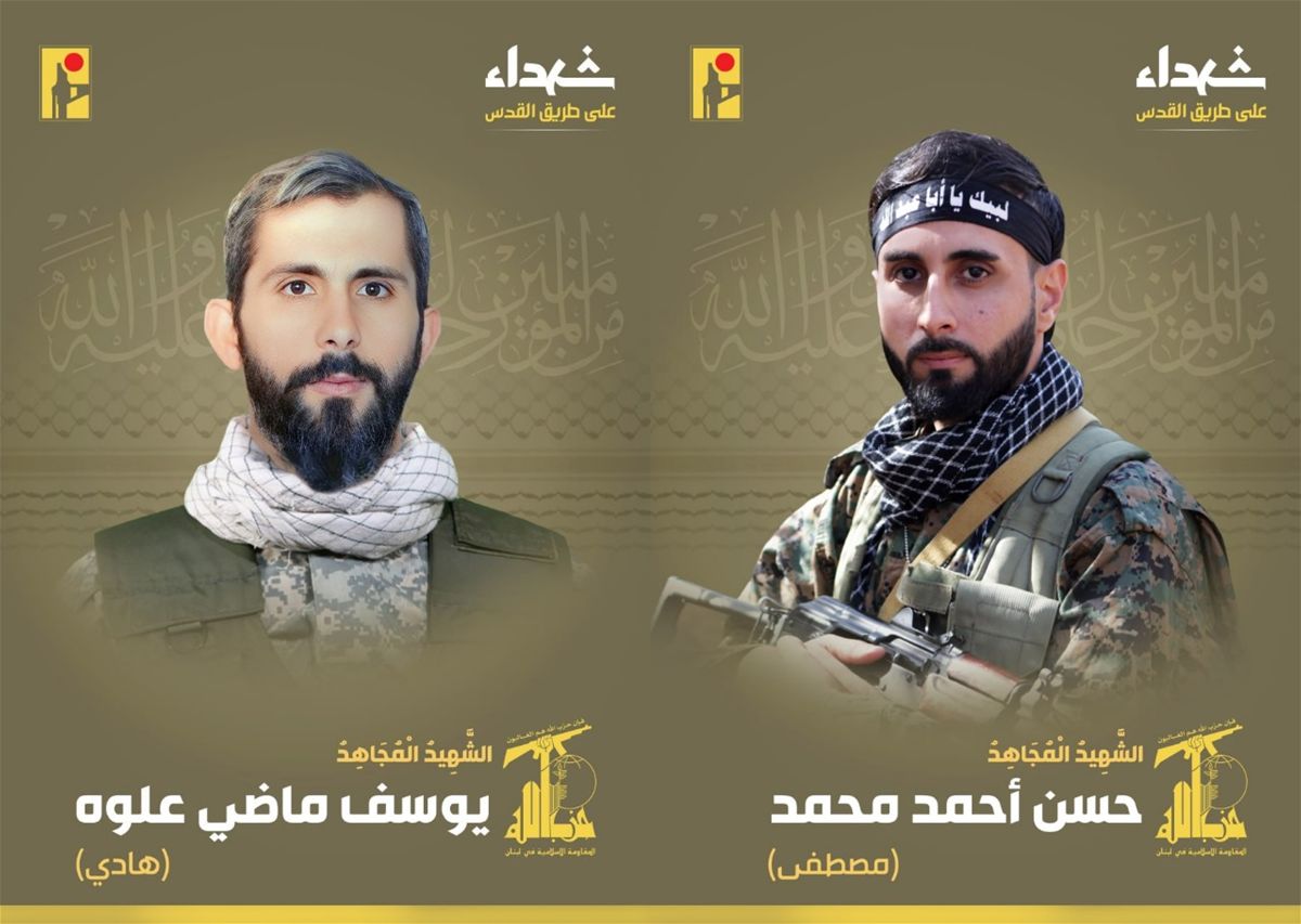 نعى حزب الله، مساء اليوم الثلاثاء، كل من الشهيد يوسف ماضي علوه "هادي" مواليد عام 1986، من بلدة بلدة الحفير التحتا، في البقاع والشهيد حسن أحمد محمد "مصطفى" مواليد عام 1992 من بلدة بلدة حبشيت، في عكّار.