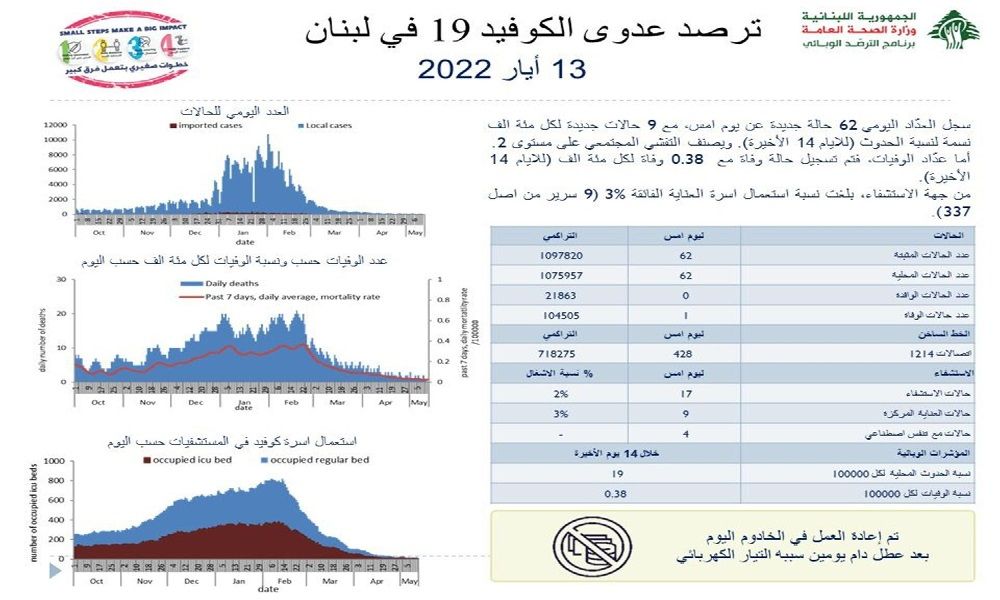 أعلنت وزارة الصحة العامة في تقريرها اليومي تسجيل “62 إصابة جديدة بفيروس كورونا رفعت العدد التراكمي للحالات المثبتة الى 1097820، كما تم تسجيل حالة وفاة واحدة”.