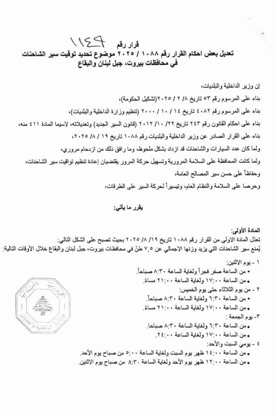 أصدت وزارة الداخلية والبلديات قراراً قضى بموجبه تعديل بعض أحكام القرار رقم 2025/1088، والموضوع تحديد توقيت سير الشاحنات في محافظات بيروت، جبل لبنان والبقاع.