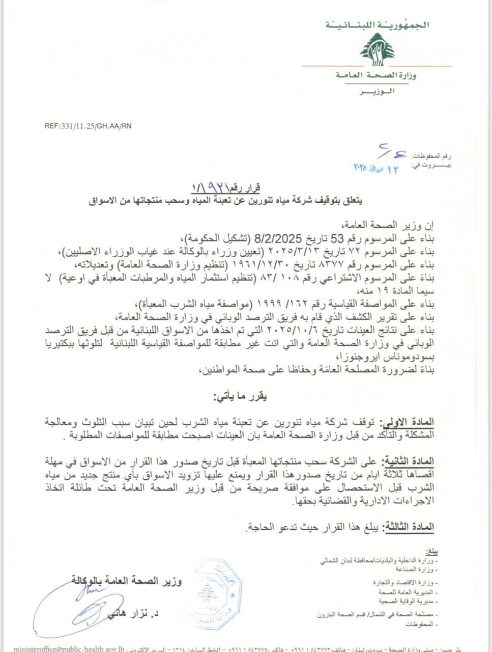 أصدرت وزارة الصحة قرارًا يقضي بتوقيف العمل في شركة مياه تنورين وسحب منتجاتها من السوق، بسبب ثبوت تلوث في منتجات الشركة، حفاظاً على الصحة العامة وسلامة المستهلكين.