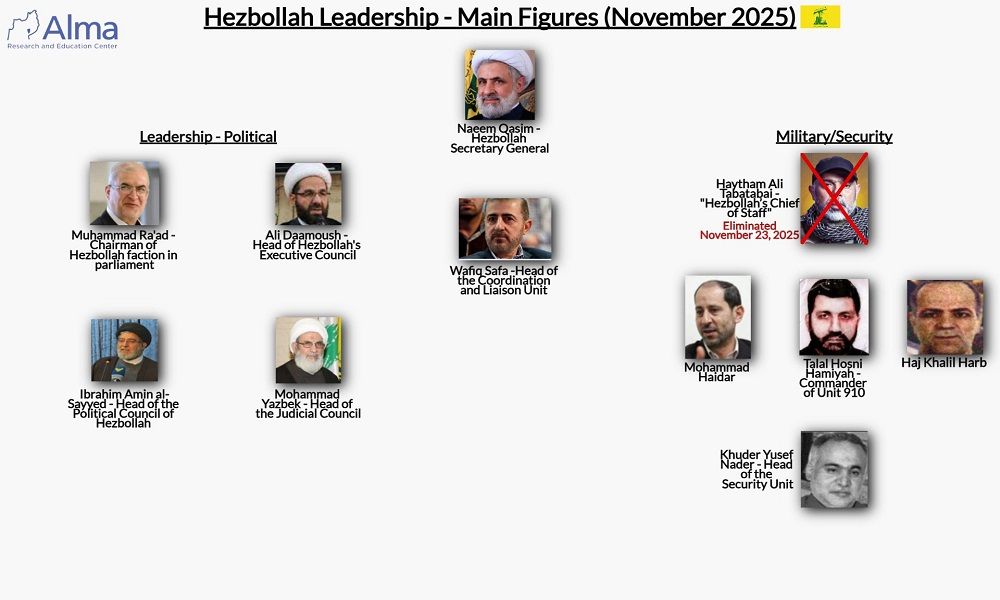 نشر مركز “ألما” الإسرائيلي عبر حسابه على منصة “إكس”، صورة يظهر فيها عدداً من القياديين في “حزب الله” على رأسهم الأمين العام للحزب، الشيخ نعيم قاسم، يليه النائب محمد رعد.