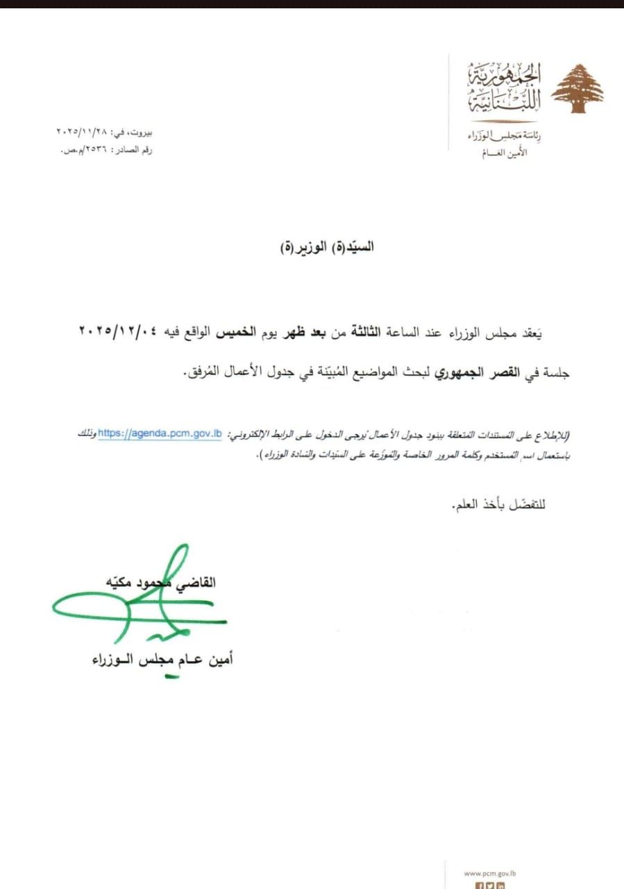 يعقد مجلس الوزراء عند الساعة الثالثة من بعد ظهر يوم الخميس الواقع فيه ٢٠٢٥/١٢/٠٤، جلسة في القصر الجمهوري لبحث المواضيع المبينة في جدول الأعمال المرفق.