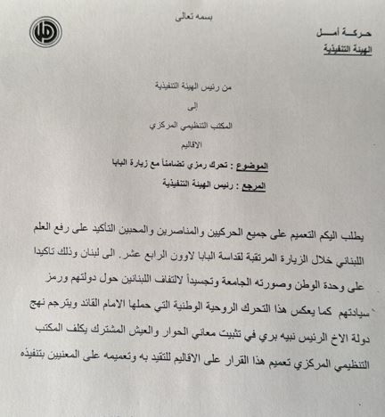 أصدرت حركة أمل، تعميماً داخلياً، تتوجه من خلاله لجميع الحركيين والمناصرين، تأكيداً على رفع العلم اللبناني خلال الزيارة المرتقبة لقداسة البابا لاوون الرابع عشر إلى لبنان.