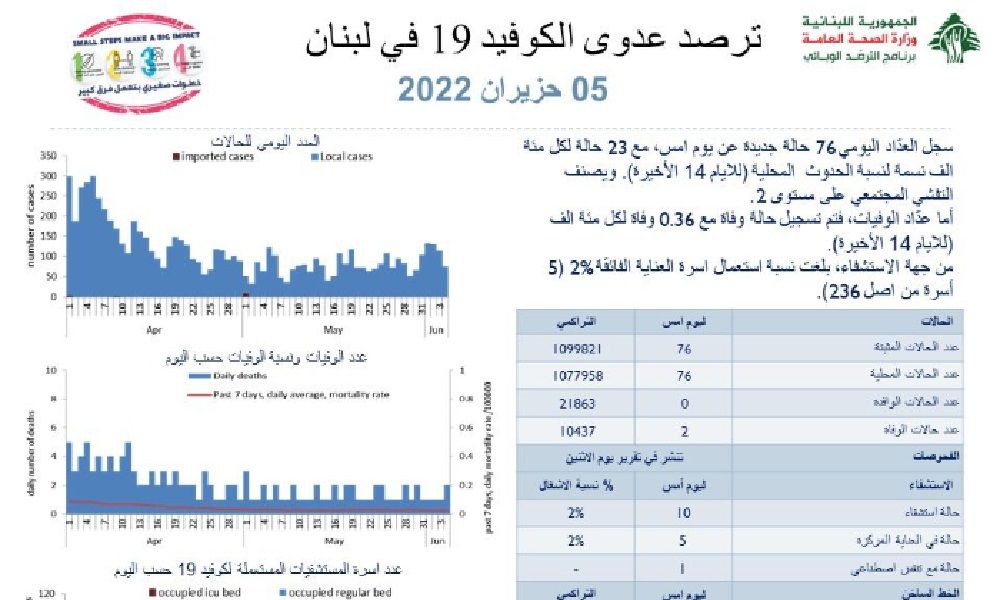 أعلنت وزارة الصحة العامة في تقريرها اليومي تسجيل ” 76 إصابة جديدة بفيروس كورونا رفعت العدد التراكمي للحالات المثبتة الى1099821، كما تم تسجيل حالتي وفاة”.
