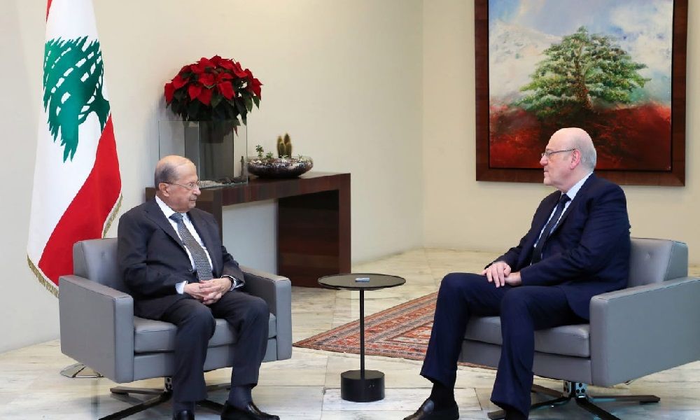 في الاجتماع، تتابع المصادر، وبعد سلام وكلام، تمت مناقشة تشكيلة حكومية من 29 وزيرا ، طلب فيها عون بابقاء وليد فياض في حقيبة الطاقة فوافق ميقاتي، بعدما كان سحب فياض من تشكيلته التي قدمها لعون في اليوم الثاني على التكليف. ثم اثير موضوع تغيير وزيري الاقتصاد والمهجرين. فاقترح ميقاتي للاقتصاد عمرالمرعبي وللمهجرين وليد عساف وابقاء الوزيرجورج بوشيكيان في حقيبة الصناعة بدل المهجرين، بحسب التشكيلة الاساسية. هنا طلب الرئيس عون التريث لبحث الطروحات والاجتماع لاحقا. فاقترح ميقاتي امكان تعويم الحكومة الحالية عوض تشكيل حكومة جديدة لكسب الوقت. فقال عون ايضا سنبحث الامر لاحقا. وعند هذه النقطة انتهى اللقاء الرئاسي.