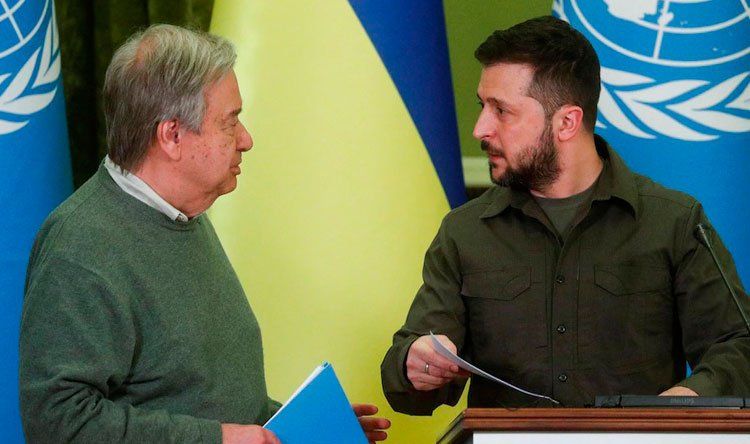 أكد الرئيس الأوكراني فولوديمير زيلينسكي، عقب وقوع قصف معمل صواريخ في كييف، وذلك بعد وقت قصير من اجتماعه بالأمين العام للأمم المتحدة أنطونيو غوتيريش، أن “الضربات الروسية على كييف هدفها إهانة الأمم المتحدة”.