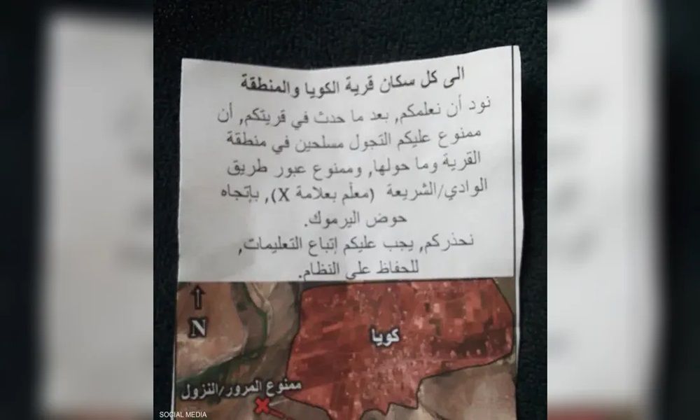 ألقت طائرات إسرائيلية اليوم الخميس، منشورات تحذر فيها من أي تجول لمن وصفتهم بـ”المسلحين” في بلدة كويا بريف درعا الغربي جنوبي سوريا.