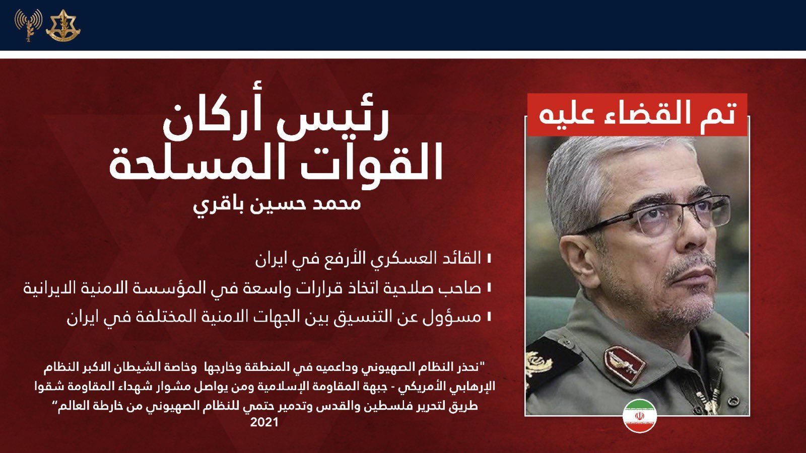 أعلن المتحدث باسم الجيش الإسرائيلي أفيخاي أدرعي، أنه “تم القضاء على رئيس أركان القوات المسلحة الإيرانية محمد باقري الذي يشغل منصب القائد العسكري الأرفع في إيران”.