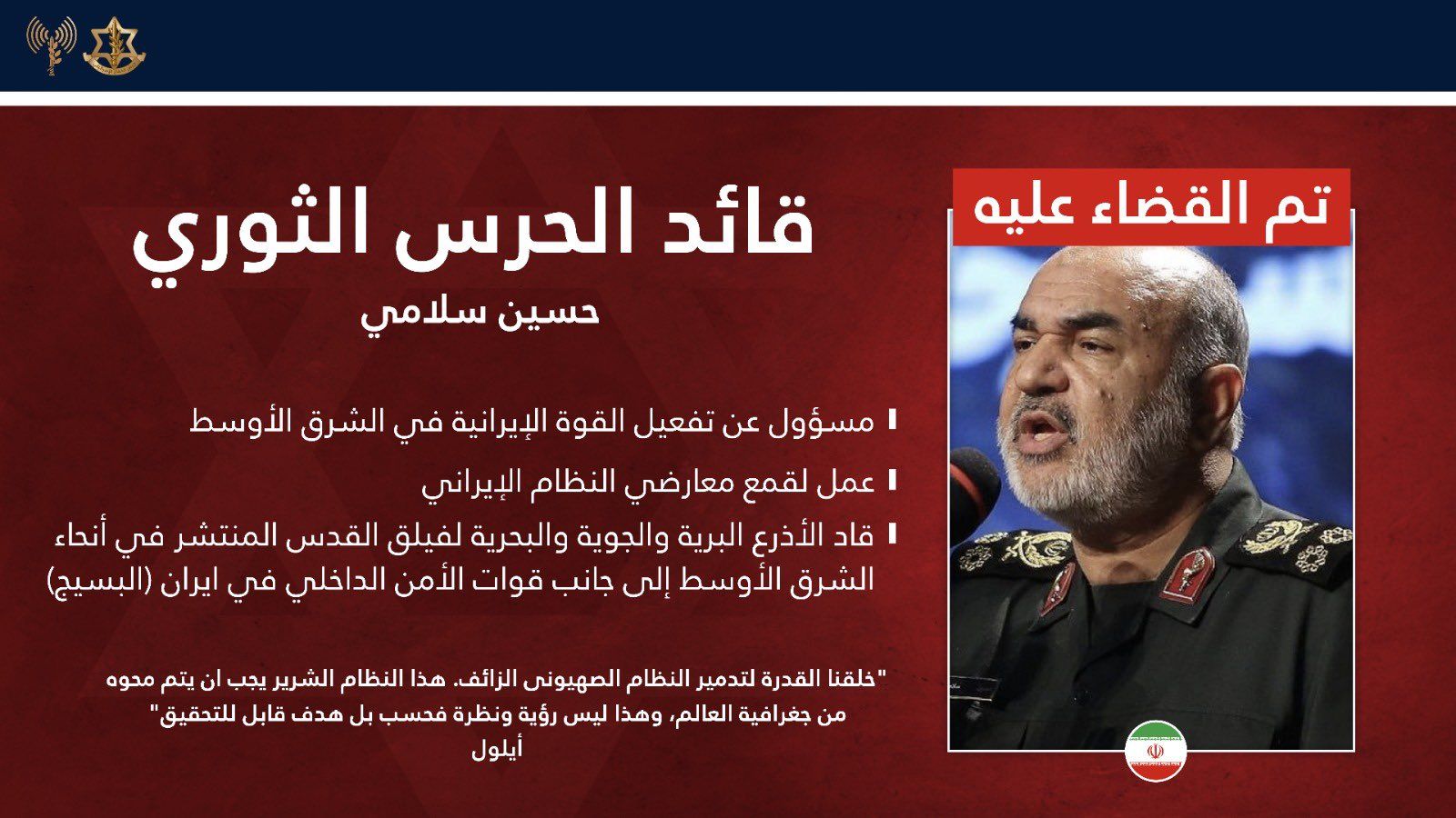 وأشار أدرعي إلى أنه “تم القضاء كذلك على قائد خاتم الانبياء غلام علي رشيد، الذي يرأس المؤسسة الامنية للنظام الايراني في اوقات الطوارئ”.
