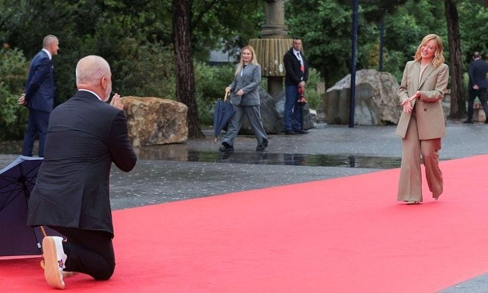 ركع رئيس وزراء ألبانيا إيدي راما، على ركبته أثناء استقبال رئيسة وزراء إيطاليا جورجا ميلوني له، خلال مؤتمر “تعافي أوكرانيا 2025” في روما.